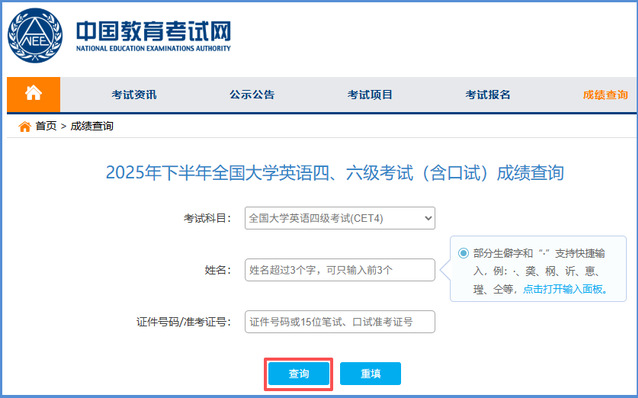 请访问网站http://cet.neea.edu.cn/cet,选择相应的考试科目,输入个人姓名和证件号码/准考证号,随后点击“查询”按钮以获取成绩信息。