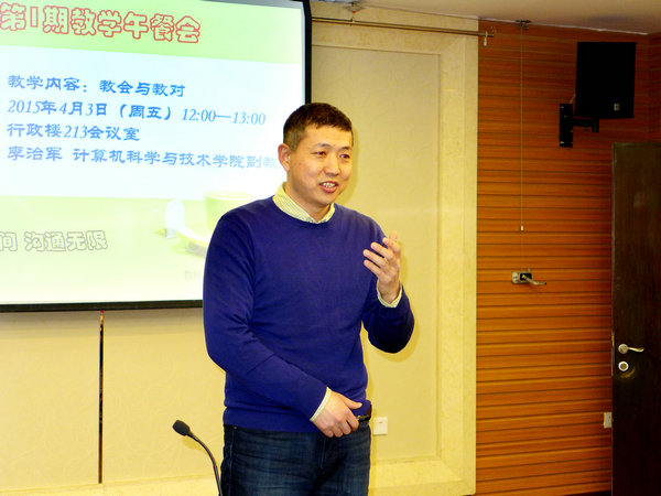 此前,计算机学院李治军副教授在4月3日主持的第一期午餐会就吸引了很多教师。围绕“教会与教对”的主题,李治军讲述了拉格朗日乘数法与一个少女的约会、于丹的南瓜、计算机科学家Andrew Y.Ng(吴恩达)等5个有趣的故事。看似互不相关的故事,却有着逻辑上的联系,生动的故事情节不仅让在场教师在午餐时间得到了身心上的放松,更是引发了他们对教与学的深刻思考。