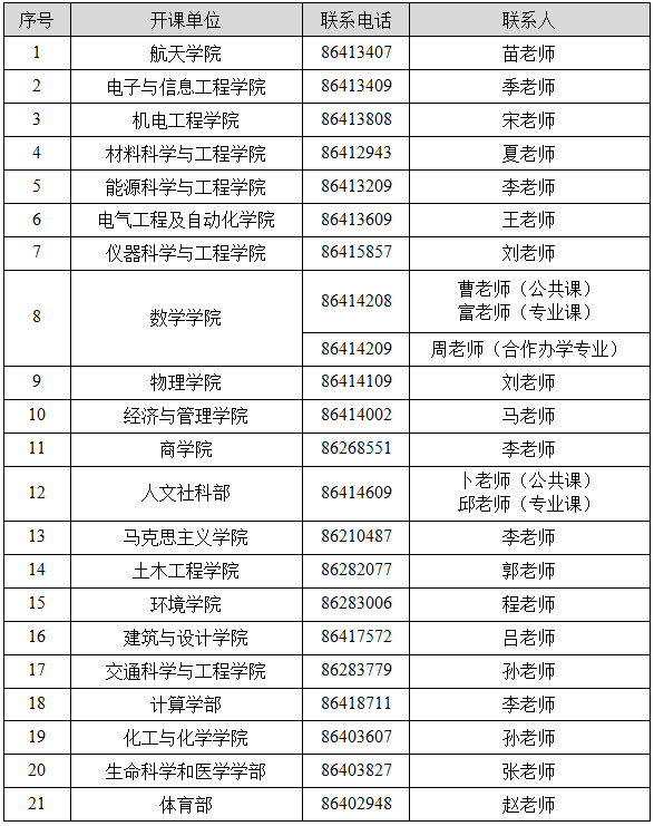 2.选课过程中如遇容量不足问题,请联系开课单位教学秘书,联系方式详见下表;如有其他问题可咨询教务处教学运行中心,电话0451-86418312/86402076/86413520。