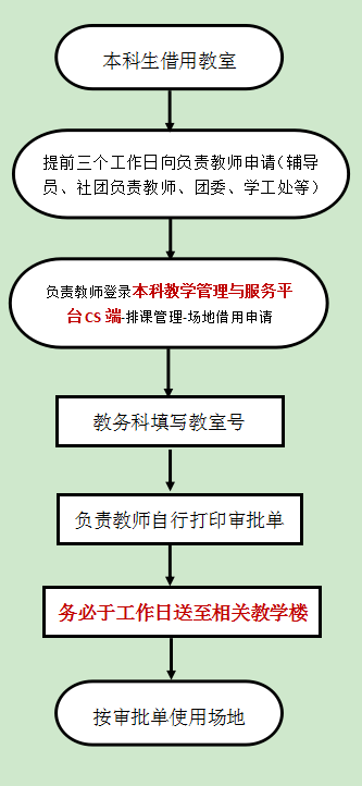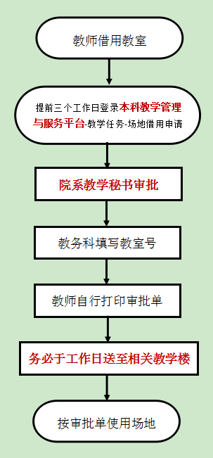 按照学校信息化建设的总体部署,为提高学校信息化工作水平,进一步推进无纸化办公的进程,优化教师及学生借用教室的审批流程,提高效率,现对借用教室的审批流程简化如下: